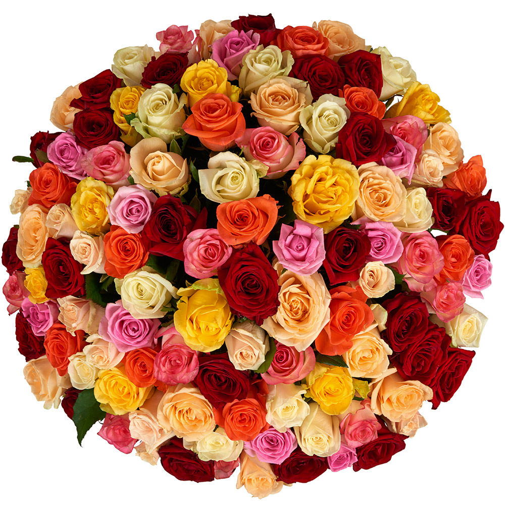 Микс российской розы (кремовая, желтая, оранжевая, красная, розовая).