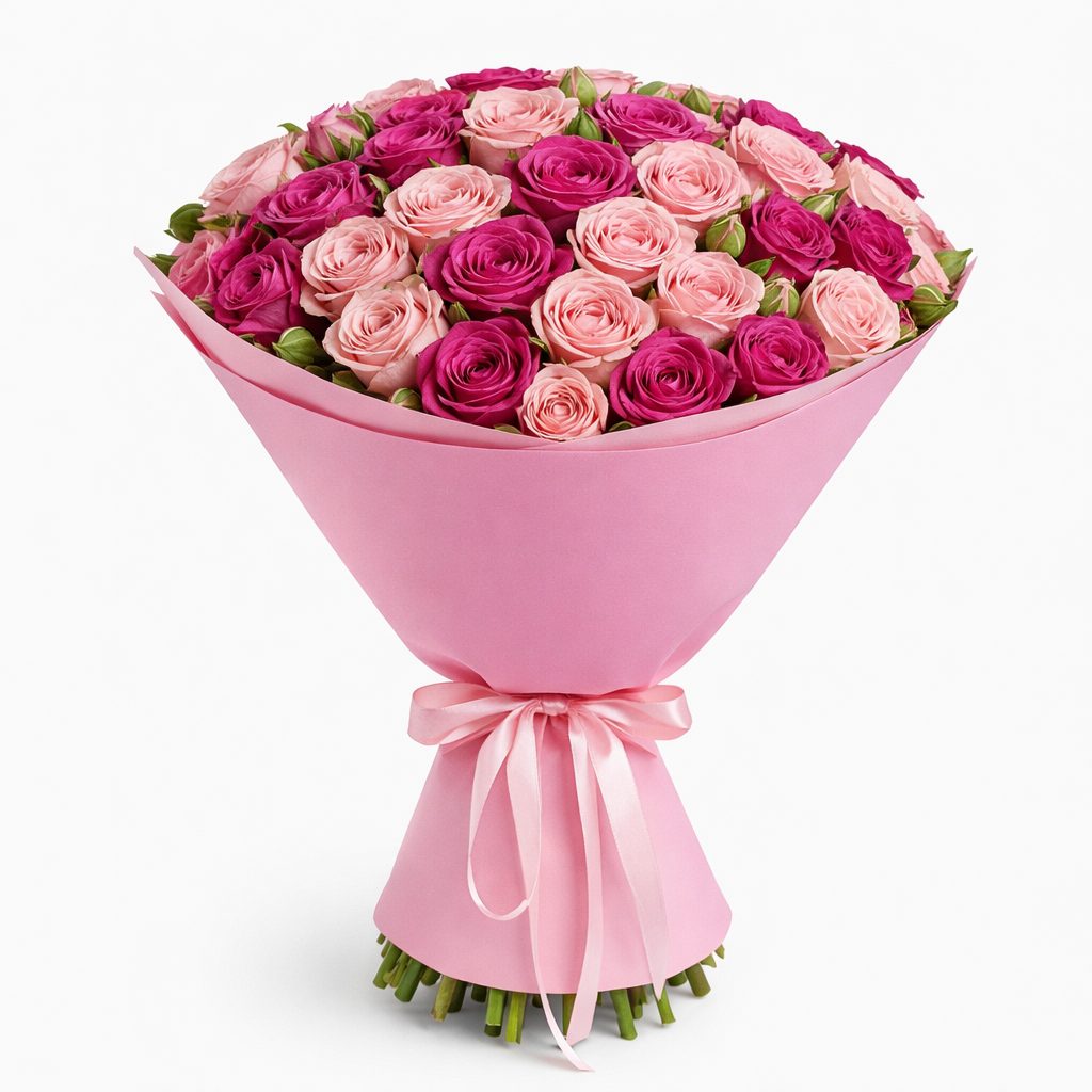 Роскошный букет из розовых и сиреневых кустовых роз создаёт атмосферу нежности и утончённости. Упакован в матовую плёнку розового цвета и перевязан атласной лентой, он выглядит особенно элегантно. Альтернативные варианты упаковки: крафт-бумага или декоративная сетка. Прекрасный подарок для любимой на годовщину или день рождения.