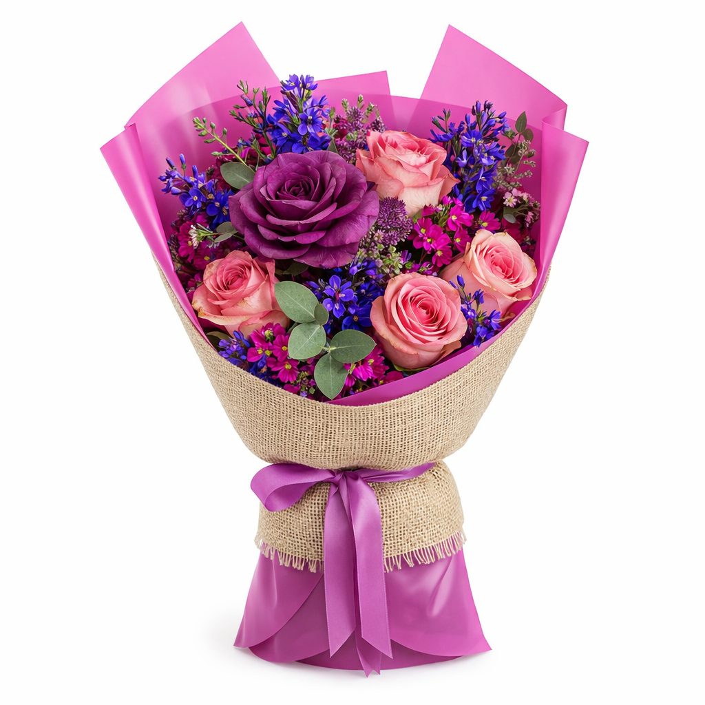 Букет «Фиолетовый Шарм» — это истинный ансамбль оттенков, в котором каждый элемент плавно дополняет соседний. Каждая мелочь имеет значение, а игра цветов формирует исключительное настроение.