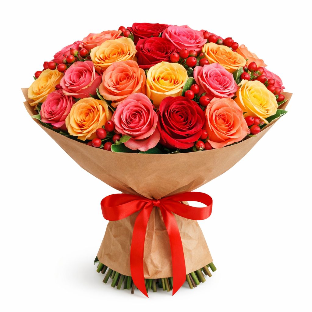 Розы одноголовые и кустовые в сочетании с гиперикумом создают яркую и насыщенную композицию. Букет оформлен в крафт-бумагу и перевязан атласной лентой. Альтернативные варианты упаковки: матовая плёнка или декоративная сетка. Прекрасный выбор для любимой на день рождения.