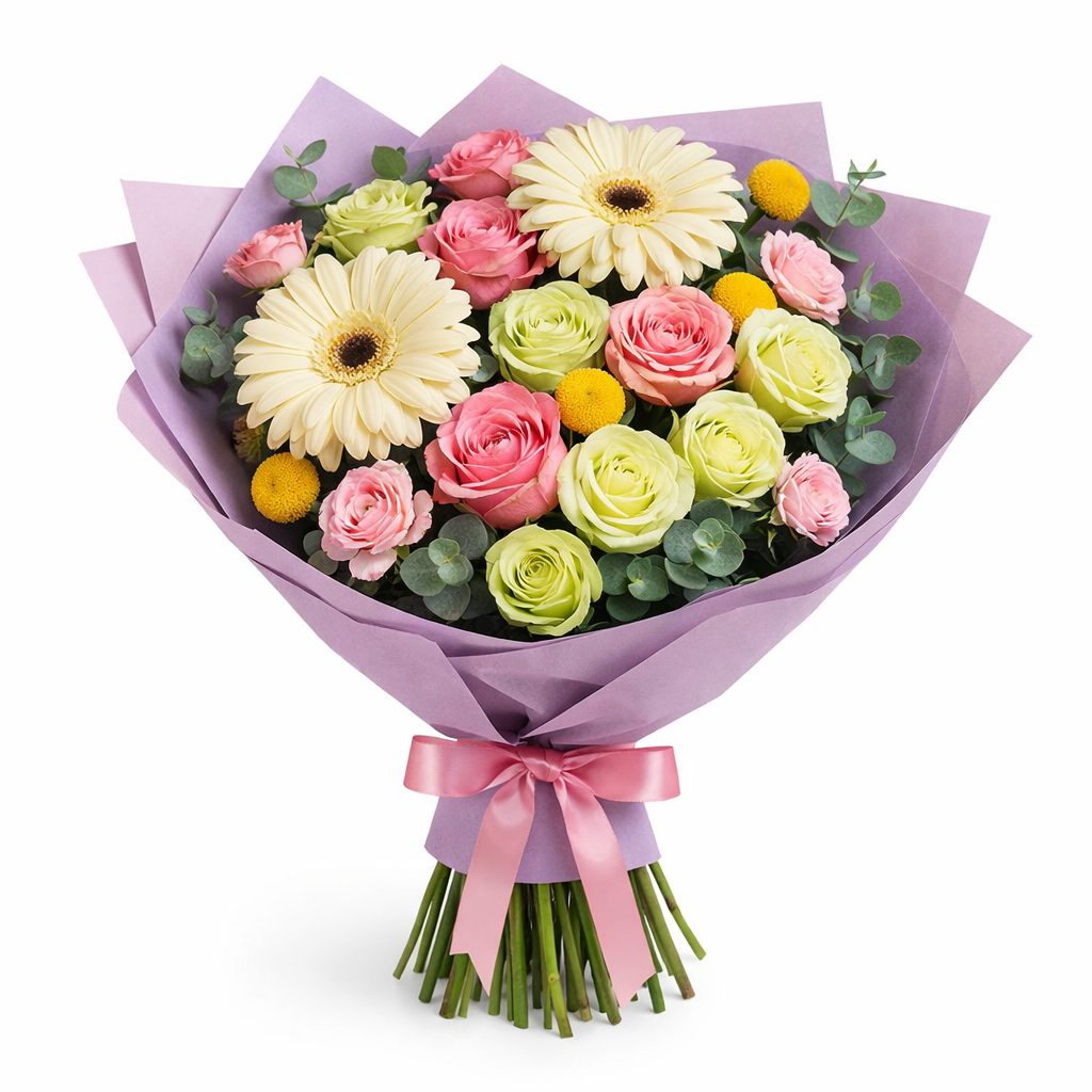Белоснежные герберы и кустовые розы в нежных оттенках розового и белого создают атмосферу лёгкости и свежести. Эвкалипт и жёлтые хризантемы добавляют яркие акценты. Упакован в матовую плёнку с атласной лентой. Возможны варианты с крафт-бумагой или декоративной сеткой. Прекрасный выбор для любимой на день рождения.