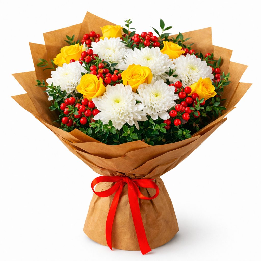 Белоснежные кустовые хризантемы и яркие жёлтые кустовые розы создают контрастный и выразительный ансамбль, дополненный гиперикумом и зеленью. Букет оформлен в крафт-бумагу и перевязан красной лентой, что добавляет ему элегантности. Возможны альтернативы упаковки: матовая плёнка или декоративная сетка. Прекрасный выбор для поздравления на день рождения или для любимой.