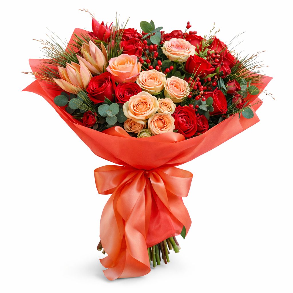 Яркое сочетание персиковых и розовых роз, красных альстромерий и гиппеаструма создаёт уникальную композицию. Эвкалипт и зелень добавляют свежести, а шишки придают оригинальности. Букет оформлен в матовую плёнку с атласной лентой. Возможна упаковка в крафт-бумагу или декоративную сетку. Прекрасный выбор для любимой на годовщину или для мамы на день рождения.