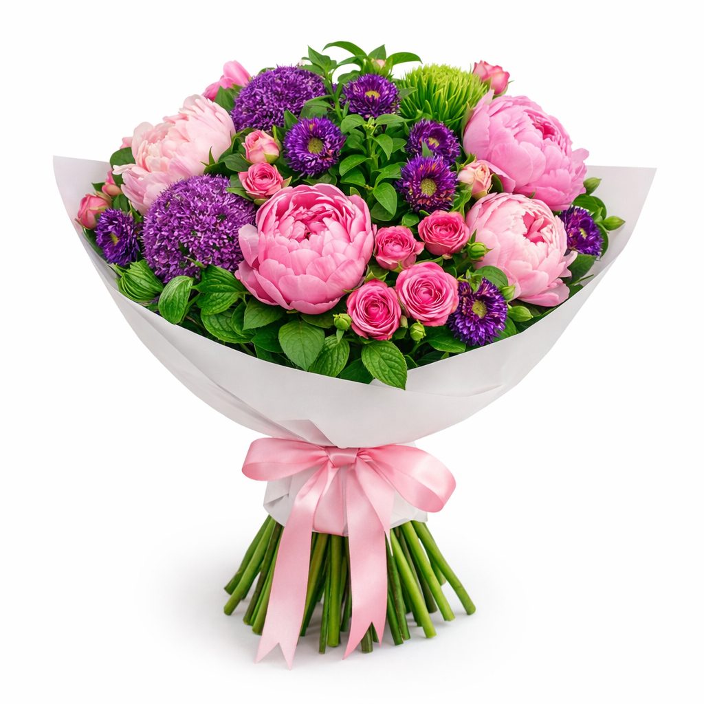 Роскошный букет из розовых пионов и кустовых роз, дополненный экзотической зеленью, создаёт атмосферу нежности и утончённости. Упакован в матовую плёнку с розовой атласной лентой, подчёркивающей изысканность композиции. Возможны варианты упаковки с крафт-бумагой или декоративной сеткой. Прекрасный выбор для подарка на день рождения для любимой или жены.
