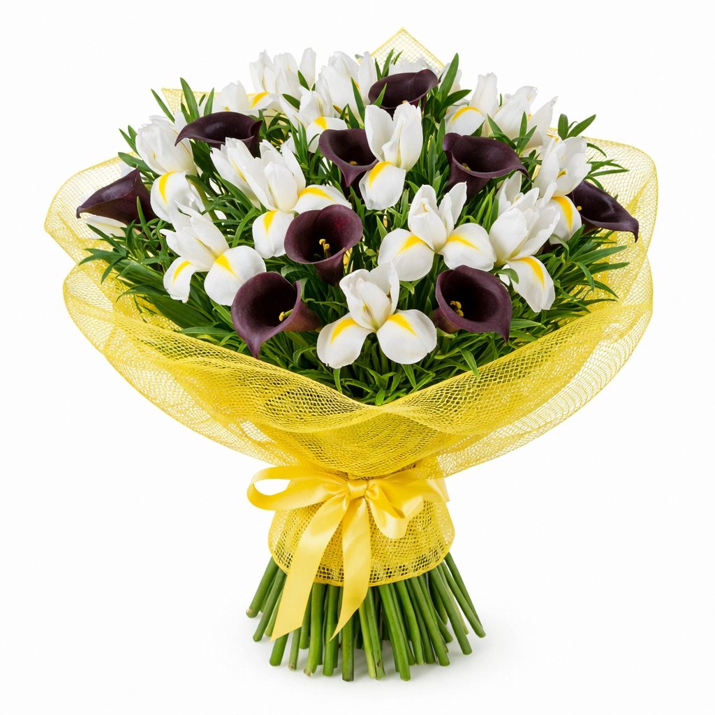Изысканное сочетание бело-жёлтых ирисов и бордовых калл, дополненное свежей фисташкой, создаёт атмосферу утреннего пробуждения. Букет оформлен в яркую жёлтую сетку и перевязан атласной лентой. Возможны альтернативы оформления: матовая плёнка или крафт-бумага. Прекрасный выбор для подарка на свадьбу или для любимой.
