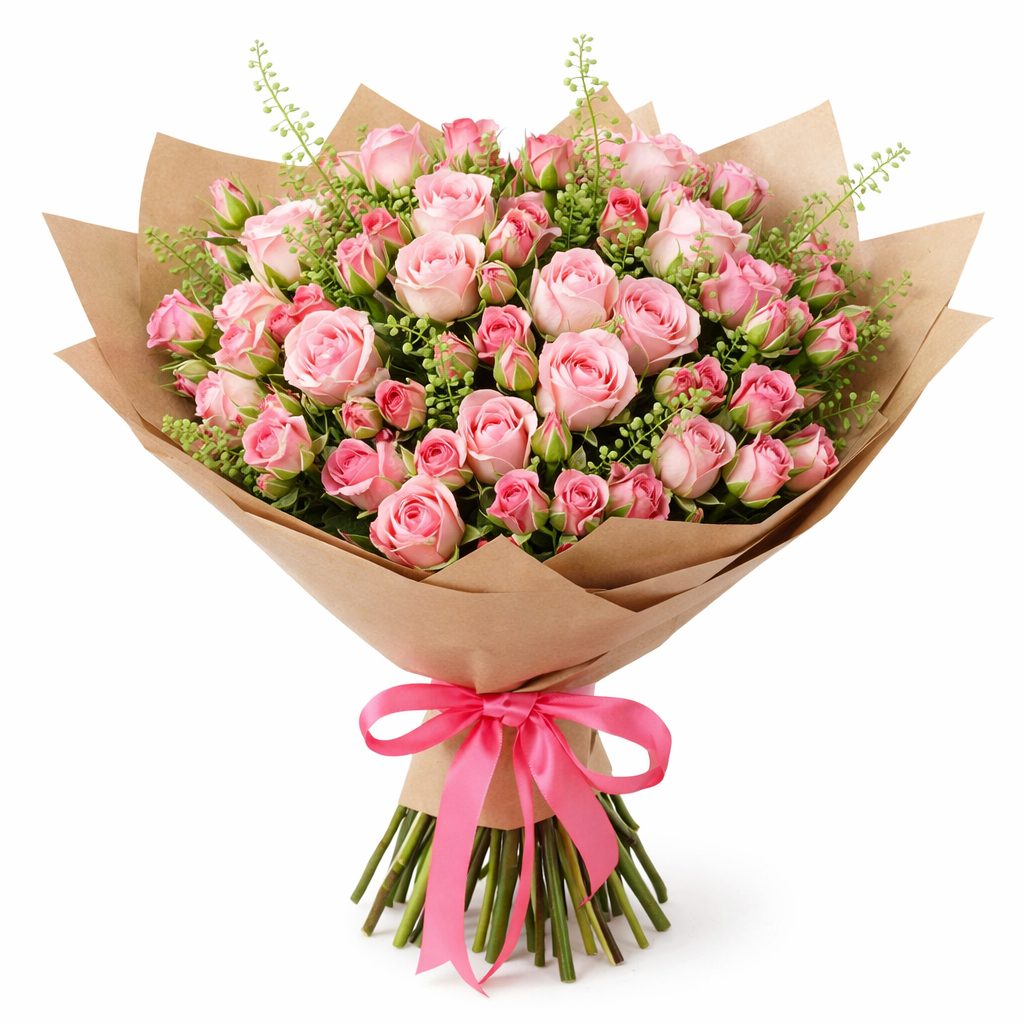 Розовые кустовые розы и тласпи создают нежное сочетание, которое очаровывает своей утонченностью. Букет оформлен в крафт-бумагу и перевязан атласной лентой яркого розового цвета. Возможны альтернативы упаковки: матовая плёнка или декоративная сетка. Прекрасный выбор для любимой на день рождения или 8 марта.