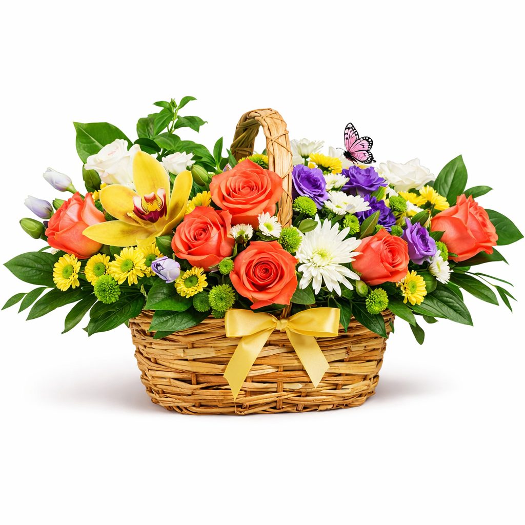 Яркая композиция из оранжевых роз, фиолетовых кустовых роз, жёлтых орхидей и хризантем, белых маргариток и эустом, дополненная зеленью бамбука и аспидистры. Корзина из натурального материала придаёт композиции естественность и лёгкость. Возможны альтернативы оформления в корзине из лозы или ротанга. Прекрасный подарок для любимой на день рождения или юбилей.