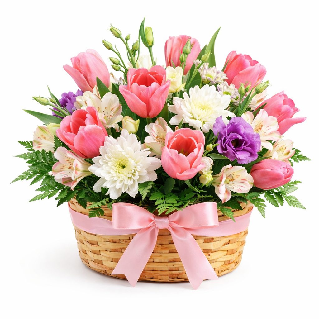 Яркие розовые тюльпаны, белоснежные хризантемы и альстромерии, фиолетовые гвоздики и свежая зелень создают неповторимую композицию. Корзина из натуральной лозы подчеркивает естественную красоту цветов. Возможны варианты оформления с плетёной корзиной или корзиной из ротанга. Прекрасный подарок для мамы на День матери или для любимой на 8 марта.