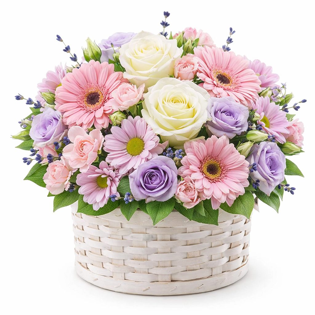 Эта изысканная композиция сочетает в себе белые розы, сиреневые хризантемы и эустомы, розовые герберы и мини-гвоздики, дополненные ароматной лавандой. Все цветы аккуратно размещены в белой плетёной корзине с оазисом. Возможны альтернативы оформления: корзина из ротанга или с тканевой отделкой. Прекрасный выбор для подарка на день рождения или для любимой.
