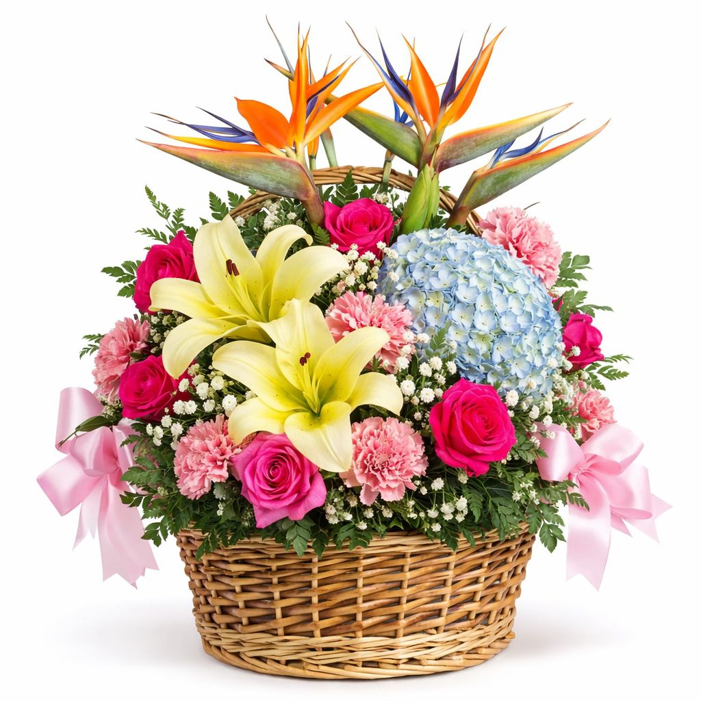 Яркая цветочная композиция сочетает в себе розовые розы, голубую гортензию, белые лилии, экзотическую стрелицию, розовые гвоздики и нежную гипсофилу. Плетёная корзина добавляет естественности и шарма. Альтернативные варианты оформления: корзина из лозы или корзина из ротанга. Прекрасный подарок для любимой на день рождения или годовщину.