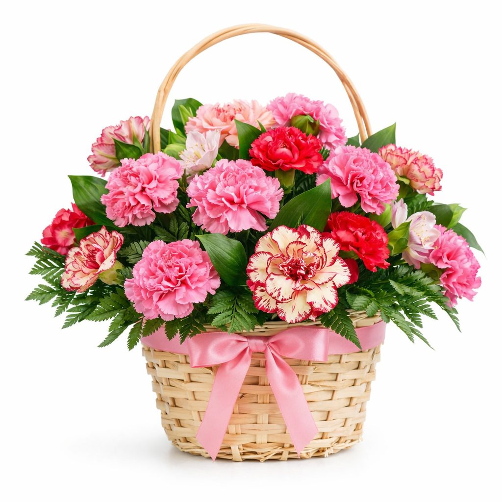 Эта яркая цветочная композиция сочетает в себе розовые гвоздики, красные мини-гвоздики и нежные розовые альстромерии, дополненные зеленью аспидистры. Цветы аккуратно расположены в плетёной корзине, создавая атмосферу уюта и гармонии. Возможны альтернативы оформления: корзина из лозы или корзина с тканевой отделкой. Прекрасный подарок для любимой на годовщину или для мамы на День матери.