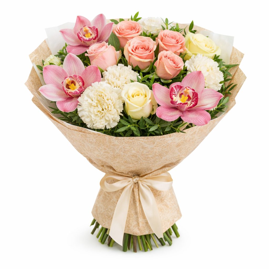 Розовые и чайные розы в сочетании с изящными орхидеями и белыми гвоздиками создают нежный и романтичный образ. Букет оформлен в крафт-бумагу и перевязан атласной лентой, что придаёт ему элегантность. Возможны альтернативы оформления: матовая плёнка или декоративная сетка. Прекрасный выбор для подарка на годовщину для любимой.