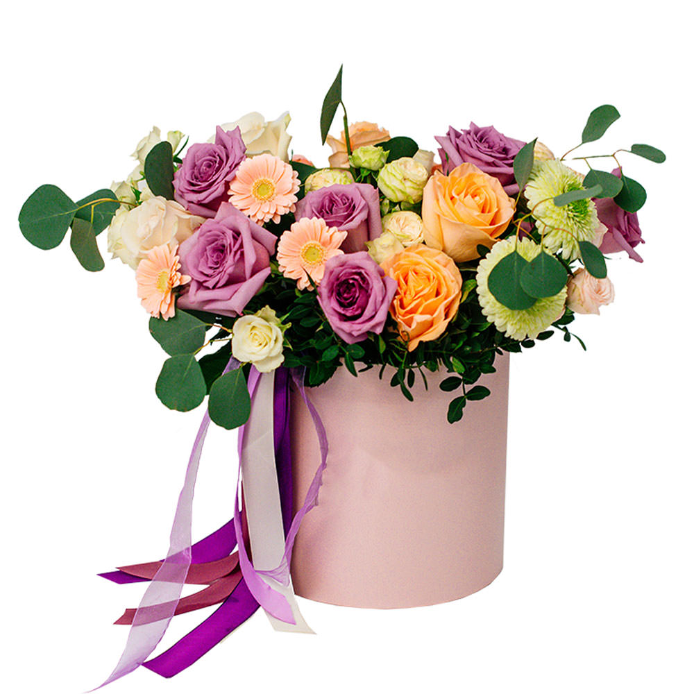 Сочетание сиреневых и персиковых роз с кремовыми мини-герберами создаёт нежную и изысканную композицию. Шляпная коробка розового цвета подчёркивает утонченность букета. Возможны варианты оформления в бархатной или атласной коробке. Прекрасный подарок для любимой на день рождения или годовщину.