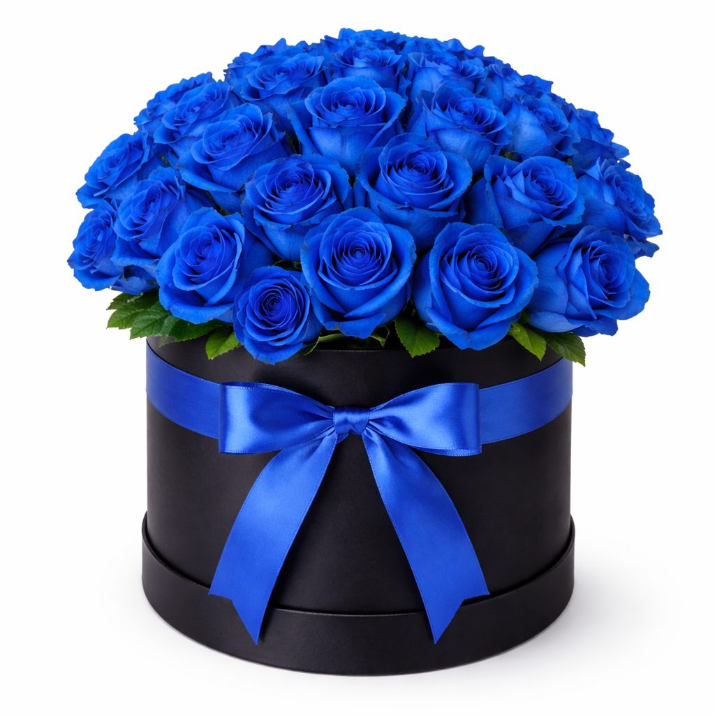 Синие розы в шляпной коробке создают впечатляющую композицию, которая завораживает своей глубиной и насыщенностью цвета. Коробка выполнена в классическом стиле, что подчеркивает элегантность и утонченность букета. Возможны альтернативы оформления: бархатная коробка или коробка с принтом. Прекрасный подарок для любимой на годовщину или день рождения.