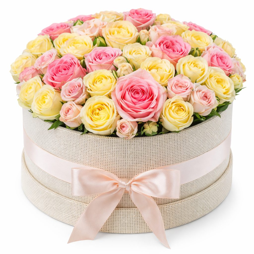 Розовые и желтые розы создают яркую и нежную композицию, которая привлекает внимание своей элегантностью. Цветы аккуратно уложены в шляпную коробку, украшенную атласной лентой. Альтернативно можно оформить в бархатной коробке или коробке с принтом. Прекрасный подарок для любимой на годовщину или день рождения.