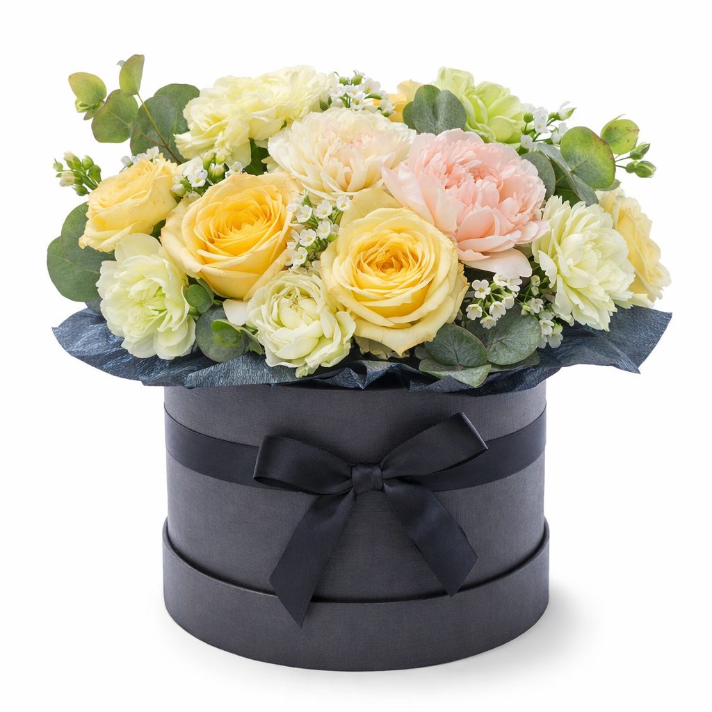 Яркие розы кустовые, нежные розовые пионы и бело-зеленые гвоздики создают удивительную гармонию в этой цветочной композиции. Белая эустома и персиковая хризантема добавляют легкости и воздушности, а эвкалипт и статица завершают образ. Композиция оформлена в элегантной черной шляпной коробке. Возможны альтернативы оформления в бархатной или атласной коробке. Прекрасный подарок для любимой на день рождения или годовщину.