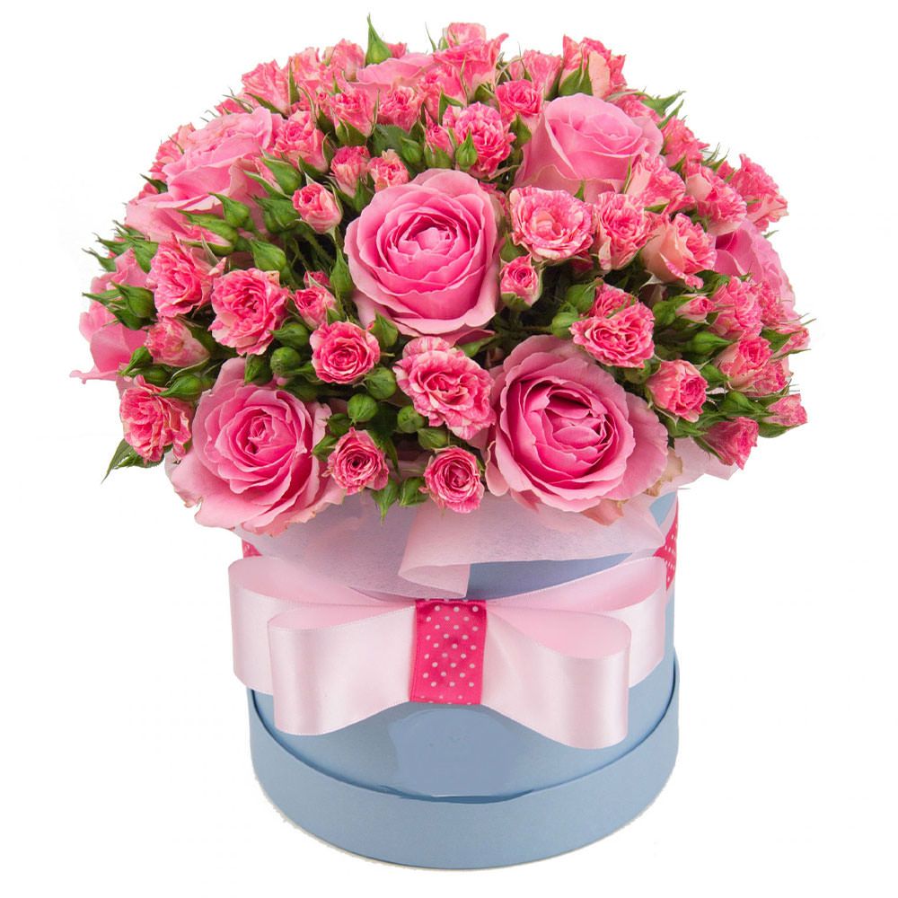Розовые одноголовые и кустовые розы создают нежную и романтичную композицию. Цветы оформлены в элегантной шляпной коробке, добавляющей изысканности. Возможна упаковка в бархатную или атласную коробку. Прекрасный подарок для любимой на день рождения или годовщину.