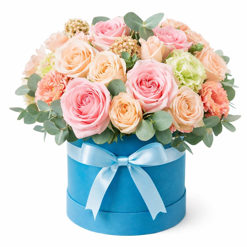 Розовые пионовидные розы, нежно-розовые кустовые розы, коралловая и белая эустома гармонично сочетаются с эвкалиптом, создавая атмосферу нежности и утончённости. Композиция оформлена в яркой шляпной коробке, которая подчеркивает её изысканность. Возможны варианты в бархатной или атласной коробке. Прекрасный подарок для любимой на день рождения или годовщину.