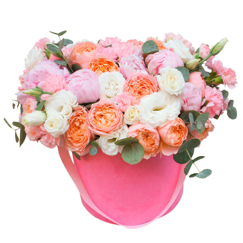 Пионы розовые, коралловые пионовидные розы и белоснежные эустомы создают яркую и нежную композицию, дополненную свежестью эвкалипта. Шляпная коробка насыщенного розового цвета придаёт букету особую элегантность. Возможны варианты оформления в бархатной или атласной коробке. Прекрасный подарок для любимой на день рождения или 8 марта.