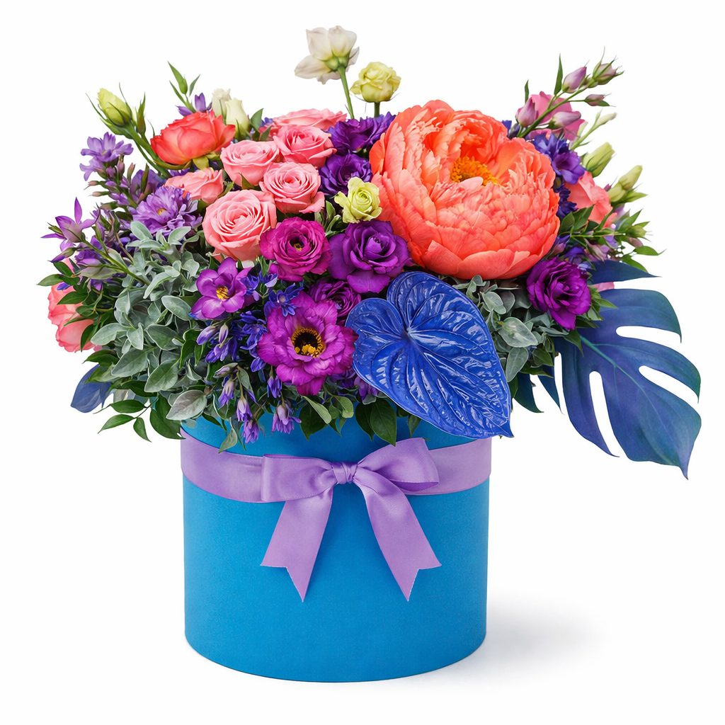 Яркая композиция из антуриума, кораллового пиона, розовых роз и кустовой гвоздики, дополненная фиолетовой эустомой и зелёной гортензией, создаёт атмосферу летнего праздника. Шляпная коробка насыщенного синего цвета подчёркивает свежесть и яркость цветов. Альтернативой может стать бархатная или атласная коробка. Прекрасный подарок для любимой на день рождения или годовщину.